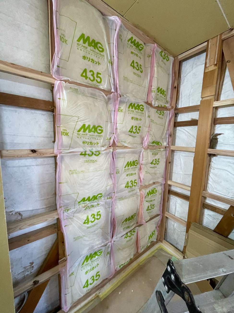 既存の内装を解体したタイミングで下地の状態を確認しながら、隙間ができないよう丁寧に断熱材を充填しています。断熱材を入れることで外気の影響を受けにくくなり、室内の温度が安定しやすくなるため、より快適に過ごせる住環境につながります。
